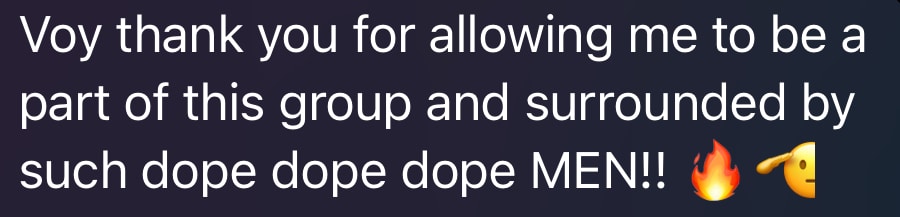 “Voy is not just another men’s coach trying to teach masculinity. He actually embodies what he teaches, and he cares about his clients. If you want someone honest in your corner to take you to the next level, then Voy is your guy.”